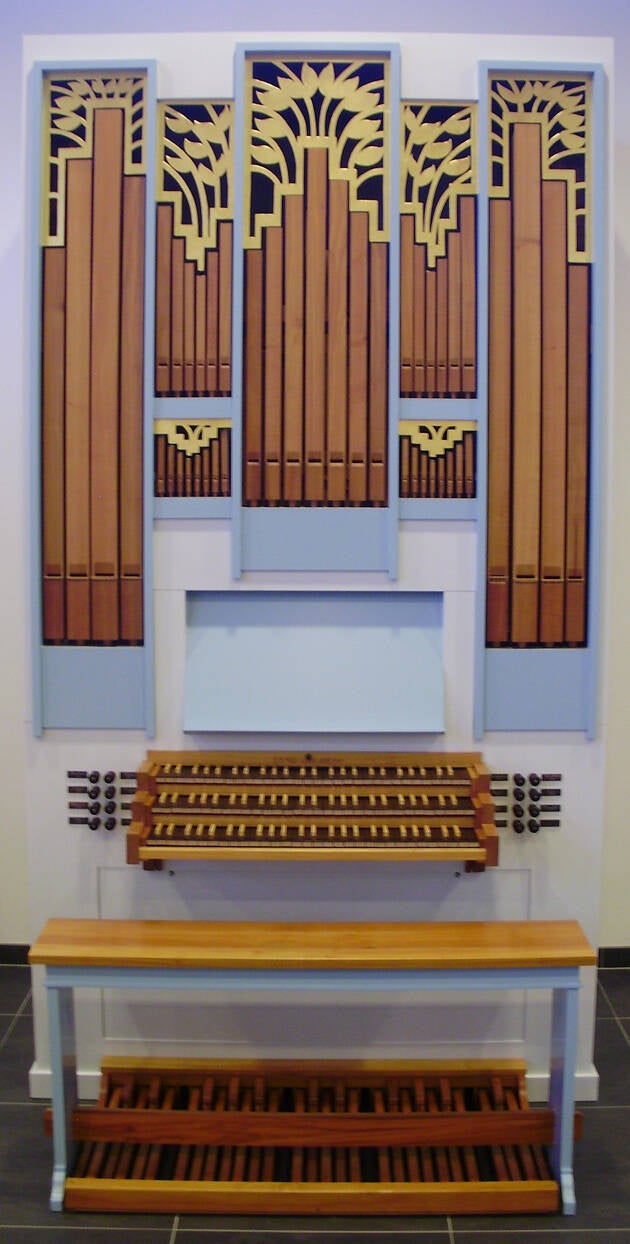 Wiegersma heeft het (sier)front van het orgel zelf samengesteld met onder andere orgelpijpen afkomstig uit de Bethelkerk in Urk.